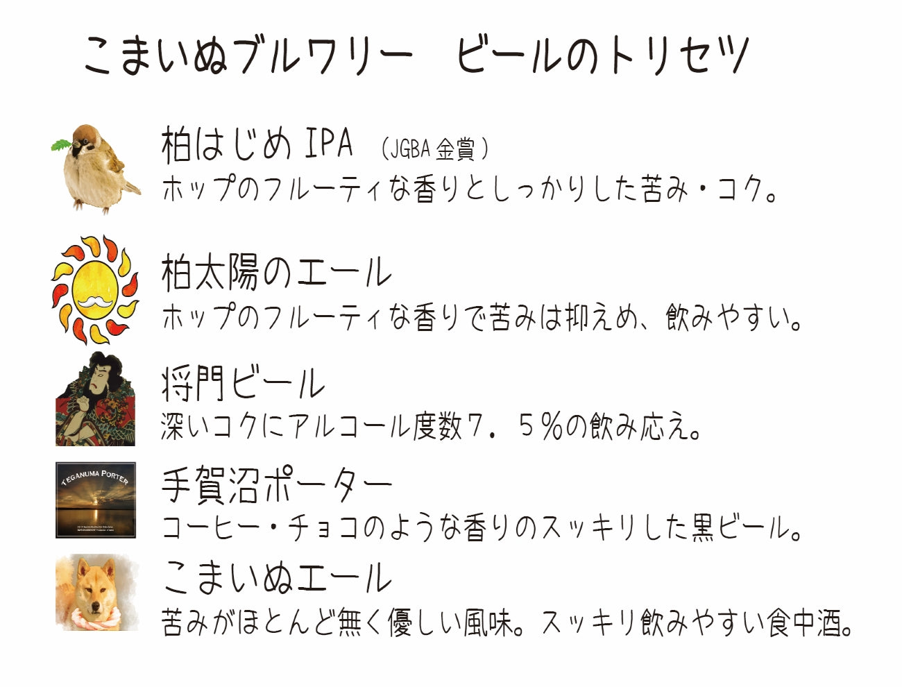 こまいぬブルワリーの定番ビールはそれぞれ全く違った特徴があります。一般的には色が薄いほどスッキリした味、色が濃いほど濃厚な味わいですが、似た色でも麦芽の焙煎やホップの使い方で全く違ったビールになります。